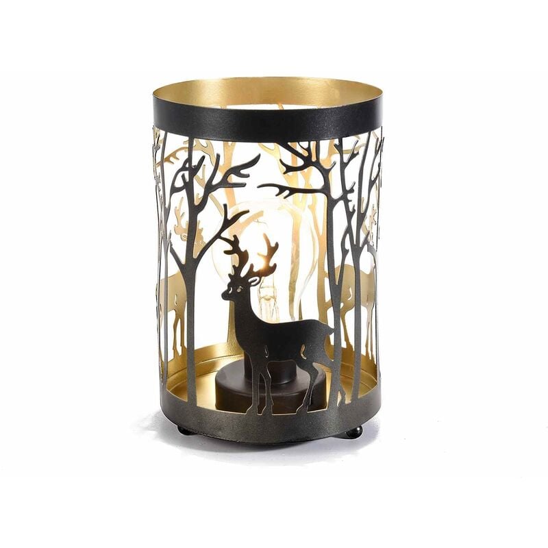 Lampada Natalizia da tavolo in metallo color nero e oro per addobbare la cassa in occasione delle festivit . Intagliata con un'elegante renna, la lampadina alimentata da 3 batterie mini stilo, non incluse, per poterla posizionare ovunque. Indicata anche come idea regalo. Misura 12,5 centimetri di diametro e 19 centimetri di altezza.
