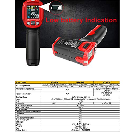 2,12 punti di riferimento dell'area di misura del cerchio, non contatto infrarosso misura. ° c/° f temperatura unità di conversione, allarme di alta/bassa temperatura e può essere impostato..