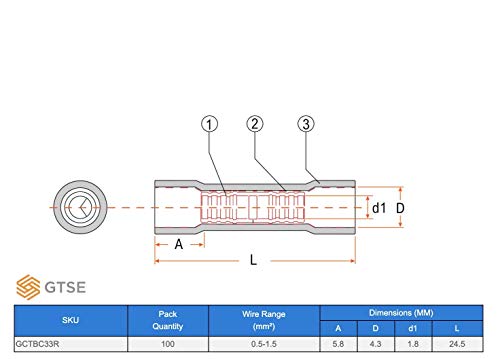 GTSE - Confezione da 100 connettori a testa rossa, 3,3 mm, terminali a crimpare pre-isolati di alta qualità