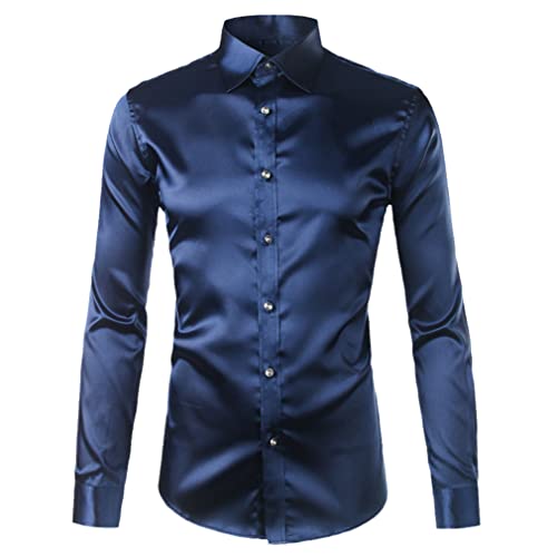 GTSFTJ Camicia da uomo in raso lucido di seta come abito liscio casual da ballo partito senza rughe Smoking Shirt, Marina Militare, M