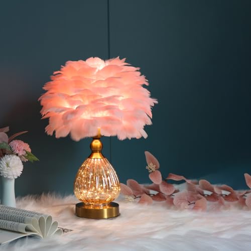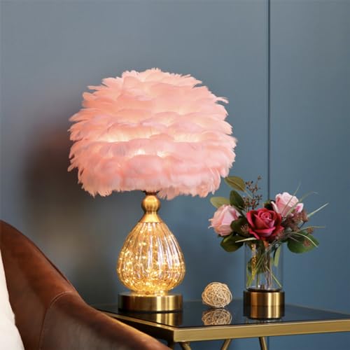 GUANSHAN Lampada da comodino in piuma di cristallo rosa Lampada da comodino in piuma di lusso Paralume da comodino in piuma Paralume da tavolo in piuma per soggiorno, camera da letto