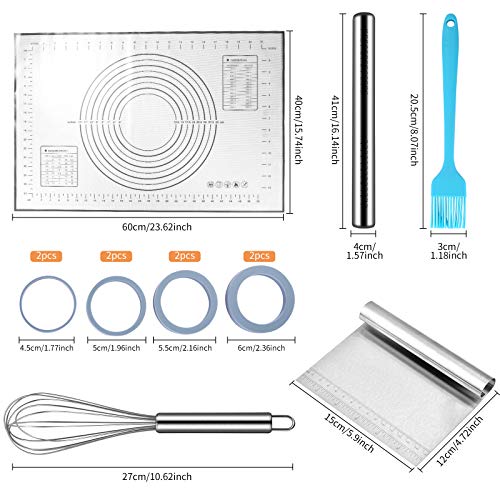 La combinazione del set mattarello: il nostro set mattarello include 1 mattarello in acciaio inossidabile con scala, 1 tappetino da forno in silicone, 1 spatola in acciaio inossidabile, 1 frullino per le uova, 1 pennello per olio di silicone e 8 per regolazioni diverse Lo spessore del silicone infarinato anello di regolazione, il kit è molto favorevole, per soddisfare le tue esigenze di cottura di base.