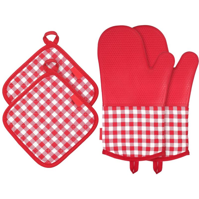 I nostri guanti da forno con la combinazione di silicone e materiale. Lo spessore e la lunghezza dei guanti ti offrono una grande sicurezza. L'utensile da cucina garantisce una migliore protezione contro il calore di piani cottura, padelle e pentole caldi rispetto a guanti in silicone comparabili. Questi guanti da forno in silicone con palmo testurizzato antiscivolo, flessibili e traspiranti, offrono una presa solida quando si estraggono dal forno le pentole calde, per un migliore controllo. Questi guanti da forno hanno un interno in cotone, morbido e soffice, facile da indossare e da togliere, e una superficie in silicone molto facile da pulire e asciugare. Guanti e maniche sono dotati di anelli per appenderli per riporli facilmente. Questo set di guanti da forno e presine è perfetto per cucinare, cuocere al forno, grigliare e grigliare. Puoi anche posizionarlo sulla tua scrivania e usarlo per appoggiare tazze da caffè o utensili da cucina. È anche un ottimo regalo per amici o