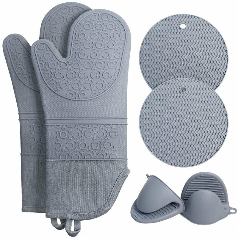 Guanti da forno, treppiedi e miniguanti premium resistenti e flessibili con una superficie strutturata a nido d'ape per un'ottima presa. Resistente al calore fino a 500 gradi Fahrenheit. Guanti da forno extra lunghi da 15" proteggono mani e avambracci da pentole calde e acqua bollente, utilizzali su un treppiede per proteggere i ripiani della cucina o come termoforo e utilizza i mini guanti da pizzico per una presa immediata. Made in silicone alimentare privo di BPA, questo set di guanti da forno e presine è durevole, non tossico, resistente al calore, antimacchia e sicuro per i tuoi cari. Il materiale in silicone impermeabile non è influenzato dal vapore o dai liquidi caldi, quindi i piani di lavoro della tua cucina rimangono asciutti e protetti. Sono inoltre lavabili in lavatrice e asciugabili in asciugatrice per un nuovo look. A differenza di altri guanti da forno che utilizzano cotone riciclato, la nostra fodera trapuntata è realizzata in cotone naturale di alta qualità per un