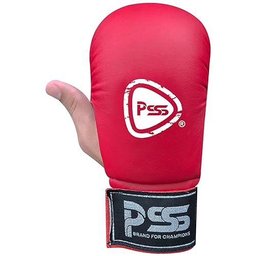 PSS Guanti da karate per bambini per boxe arti marziali jab allenamento sparring junior pad aperto dito palmo stile senza pollice nero blu e rosso colore 1018 (1018 rosso, L)