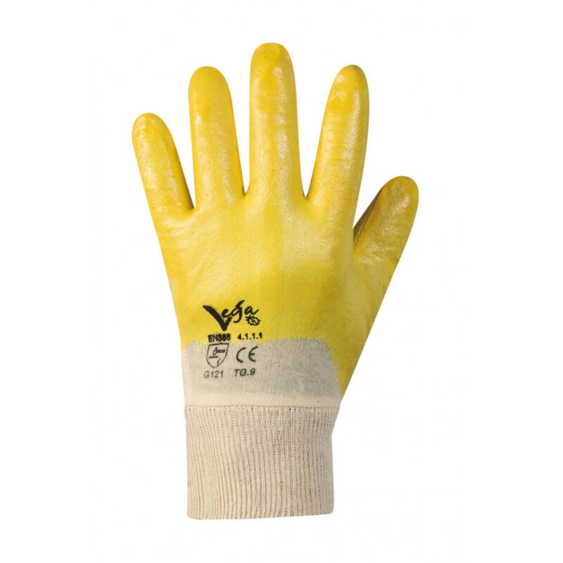 Supporto cotone e NBR giallo Supporto: 100% cotone. Spalmatura: NBR giallo su palmo, dita e nocche. Vantaggi: dorso areato, contatto della mano con il cotone per un eccellente comfort ed un buon controllo della sudorazione. Utilizzi: edilizia, assemblaggi, scarico merci, falegnameria. Se vuoi la confezione intera, devi acquistare: 12 unità
