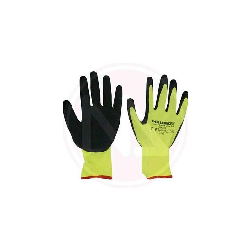 GUANTI da LAVORO in LATTICE Mod. HI-GRIP MAURER Conf. 12 pz Guanto filato in poliestere giallo ad alta visibilità senza cuciture - Spalmatura in lattice nero su palmo e punta delle dita, pollice tutto ricoperto - Finitura microporosa che garantisce un grip superiore in condizioni di lavoro secche, umide o oleose - Presa ferma e sicura - Polso elasticizzato - Resistenza abrasione 3, taglio 1, strappo 2, perforazione 1 - Ideale per assemblaggio, edilizia, ispezioni, manipolazione materiali, manipolazione rifiuti, giardinaggio - Norme CE EN 388 3121 - Cf. cavaliere Confezione: 12 PA Tipo Polsino