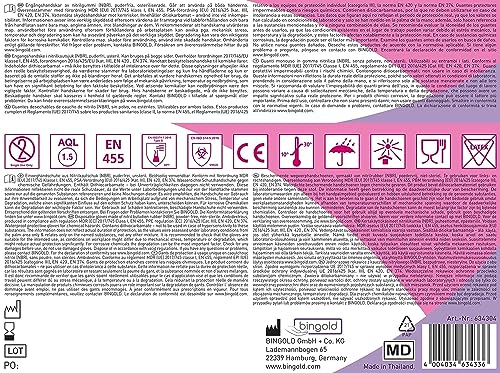 I guanti protettivi in nitrile sono conformi alle norme EN 420, 455.374 e AQL 1.5 e sono adatti per alimenti