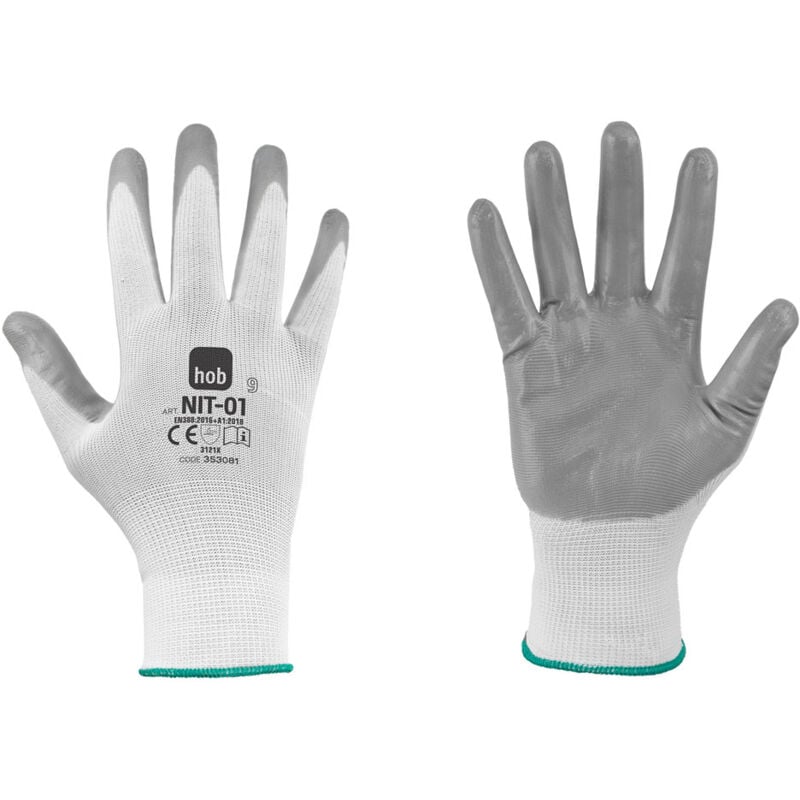 Guanti nitrile/poliestere 'nit-01 hob special' tg. 10 - colore bianco/grigio Palmo e dita ricoperte in NBR. Polsino elasticizzato, senza cuciture e dorso aerato. Impiego: logistica, magazzino, idraulica, falegnameria, edilizia, trasporti, industria automobilistica, carpenteria metallica leggera, manutenzione generale ed assemblaggio. Certificazioni EN 388:2016+A1:2018. Marcatura CE. Dispositivo di Protezione Individuale - II categoria, CE ai sensi del Regolamento (UE) 2016/425. Confezionato al paio con cavallotto. Tg. 10 - colore bianco/grigio Categoria dell'articolo: Segnaletica ed antinfortunistica - Guanti da lavoro