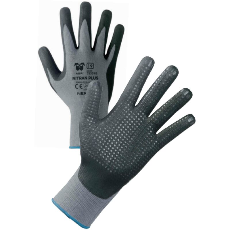 12,0 PA Di GUANTI NYLON/NITRILE NITRAN PLUS TG. 9 Mod. NITRAN PLUS maglia in nylon calibro 15 con rivestimento in nitrile schiumato sul palmo puntinato. Polso elasticizzato e dorso aerato che conferisce traspirabilita al guanto. Leggeri, garantiscono un ottima resistenza allabrasione. Forma ergonomica, assenza di cuciture. A norma CE EN 3882016 . Colore nero, grigio. Taglia 9