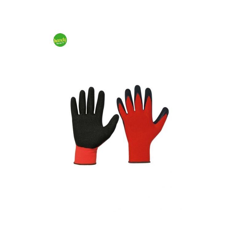 Guanti, prodotti dal brand Guantificio Senese, in maglia a filo continuo di nylon con spalmatura in schiuma di lattice sul palmo e sulle dita. Questiguanti di protezione hanno il polsino elasticizzato per una calzata confortevole, assicurano un'eccellente presa e sensibilità. Ideali da indossare nel settore edile e automobilistico, nella logistica e movimentazione merce,nella manutenzione meccanica. I guanti sono in colore rosso e nero, taglianumero 10.