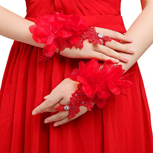 Guanti da sposa da donna chic con fiore in pizzo senza dita, per occasioni speciali da sera e Halloween, accessorio, Rosso, Taglia unica