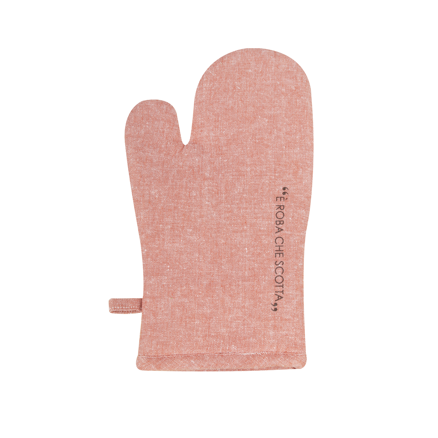 Afferrare tortiere e teglie calde da estrarre dal forno non sarà un problema con questo pratico guantone. Il rivestimento interno in poliestere unito al rivestimento esterno in cotone isolano il calore, creato con il contatto con accessori caldi o bollenti, preservando le tue mani da scottature accidentali. Potrai così eseguire le tue preparazioni in cucina in tutta sicurezza! In più la bella trama rosso ruggine impreziosita dalla simpatica scritta È roba che scotta si adatterà bene alla tua cucina: potrai appendere il guanto in bella vista, sempre pronto all'uso e abbinarlo al set di presine coordinato. Lavabile in lavatrice.