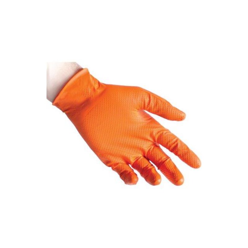 Guanto nitrile monouso arancio 3d full grip (2 confezioni) Gr 8,4 aql 1,5 senza polvere cf=pz 50 m in nitrile monouso senza polvere. con speciale grip 3d su tutto il palmo e le dita per una presa ottimale. con un peso di gr. 8,4 ed uno spessore di mm. 0,15-0,20, è particolarmente adatto nei settori industriali ed automotive.