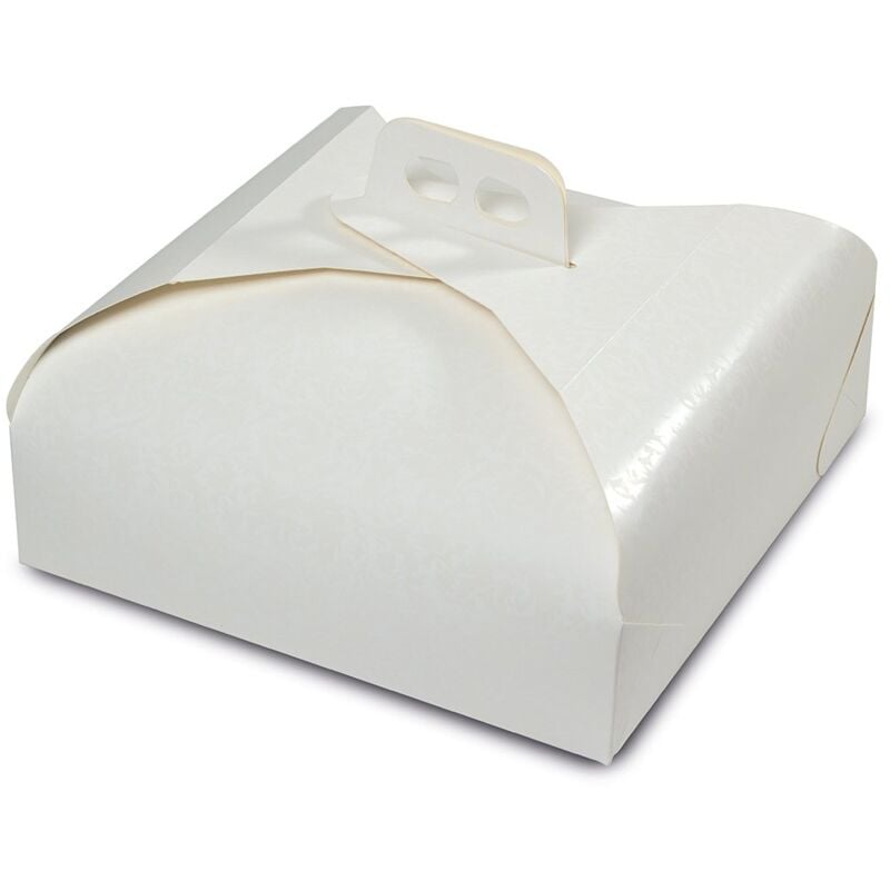 Descrizione Scatola porta torta monouso (1 pz.) realizzato in carta adatta al contatto alimentare. Dimensioni cm 33 x 33 x 11.5 H. Ideale per trasportare le tue torte. Contenuto della confezione Scatola porta torte in cartoncino bianco 33 x 33 cm