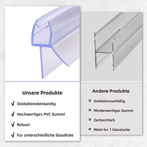 Applicabilità: 2 guarnizioni di ricambio da 40 cm. La lunghezza del labbro di 12,5 mm si adatta perfettamente alla fessura di 10-12 mm. Il deflettore laterale protegge dagli spruzzi d'acqua. La guarnizione si adatta a tutte le porte in vetro con uno spessore di 5/6 mm (attenzione, porta della doccia con il pavimento. La distanza non è superiore a 12 mm)