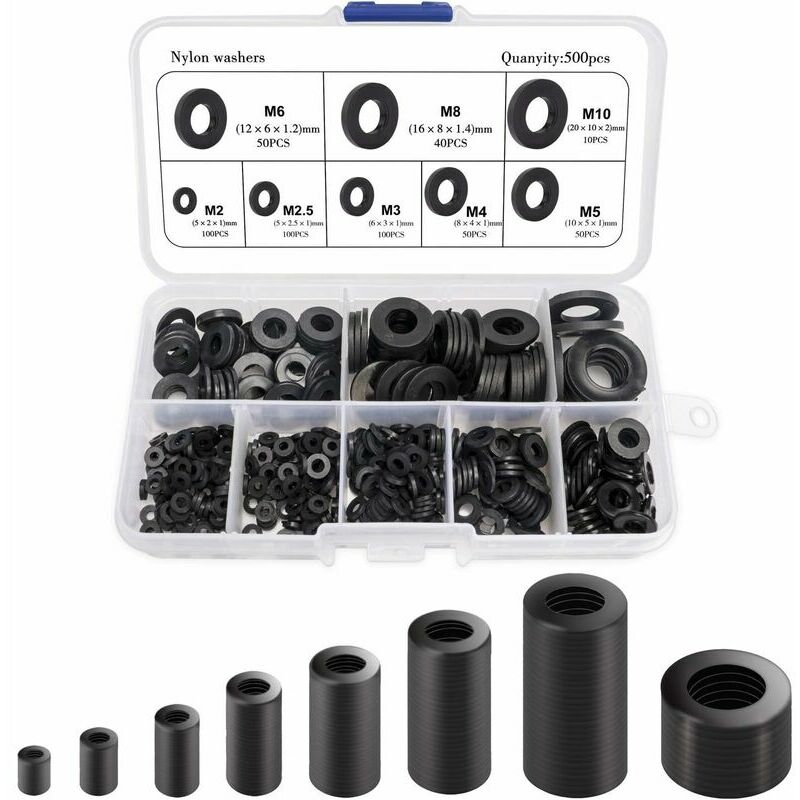 Descrizione del prodotto Qualità premium Queste rondelle piatte nere sono realizzate in nylon durevole di alta qualità, resistente all'usura, resistente alla corrosione e buon isolamento. Ampia gamma di usi a casa o al lavoro. Perfetto per collegamenti elettrici ad elettrodomestici e elettrodomestici, applicazioni automobilistiche e marine. Attenzione: Il materiale è plastica di nylon, non gomma. Le rondelle sono anelli di tenuta non elastici e non flessibili. Ben classificato: un totale di 500 pezzi in 8 diverse dimensioni di rondelle piatte sono pre-classificati per una facile identificazione e per prevenire la perdita. La scatola dell'assortimento non solo aiuta a conservare bene le rondelle, ma anche a trasportarle e conservarle facilmente.