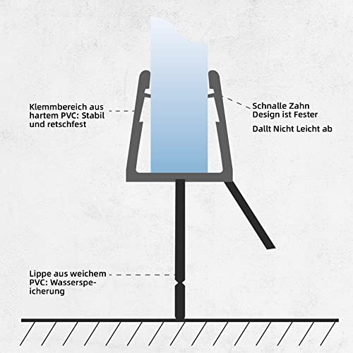 Lavorazione di alta qualità: le nostre guarnizioni per doccia sono realizzate in materiale di alta qualità. Il morsetto è realizzato in PVC rigido trasparente e stabile e il labbro in PVC morbido. Si distingue per la sua resistenza ai raggi UV e alla muffa, garantendo una lunga durata della guarnizione per doccia