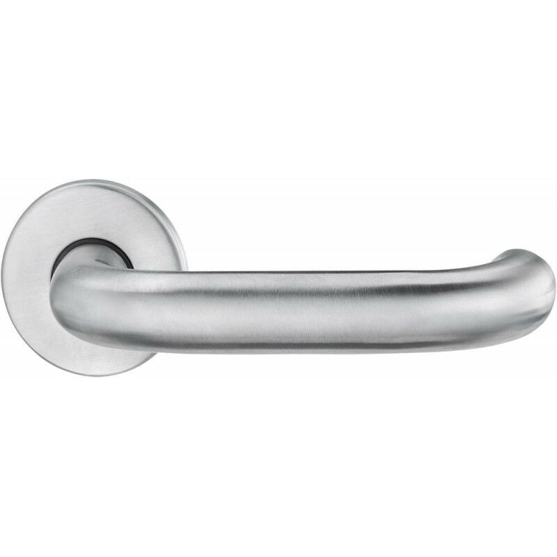 Maniglia a leva per porta di casa mezzo set Riva 2103/5200 - In acciaio inox. opaco - Cuscinetto fisso - Collegamento a perno. avvitato a scomparsa. con camme di supporto - Coperchio senza rosetta per chiave. con rosetta per maniglia a leva - Sottostruttura in acciaio. rotonda. Diametro 55 mm - L'impugnatura può essere utilizzata in direzione destra/sinistra. Fissaggio maniglia a perno pieno - Per porte esterne. Materiale legno. Acciaio