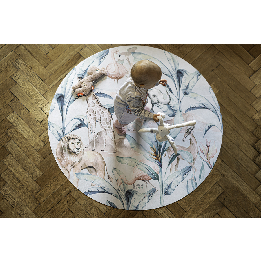 Dettagli del prodotto: Tappeto da gioco in gomma naturale Il tappetino ergonomico garantisce un buon sviluppo Buona presa sul pavimento Lo strato di gomma assorbe gli urti Le microfibre corte prevengono lo sviluppo degli acari Design Vita africana Dimensioni e peso: Dimensioni (diametro x altezza): 118 cm x 4 mm. Peso: 2 kg Materiale e cura: Materiale: gomma naturale biodegradabile. Materiale strato superiore: microfibra Privo di sostanze chimiche nocive, PVC, BPA e ftalati L'odore della gomma è quello della gomma naturale, che si attenua con il tempo. Istruzioni per la cura: pulire le macchie con un panno umido e sapone neutro o lavare a mano senza detersivo. Incluso nella consegna: Tappetino in gomma naturale