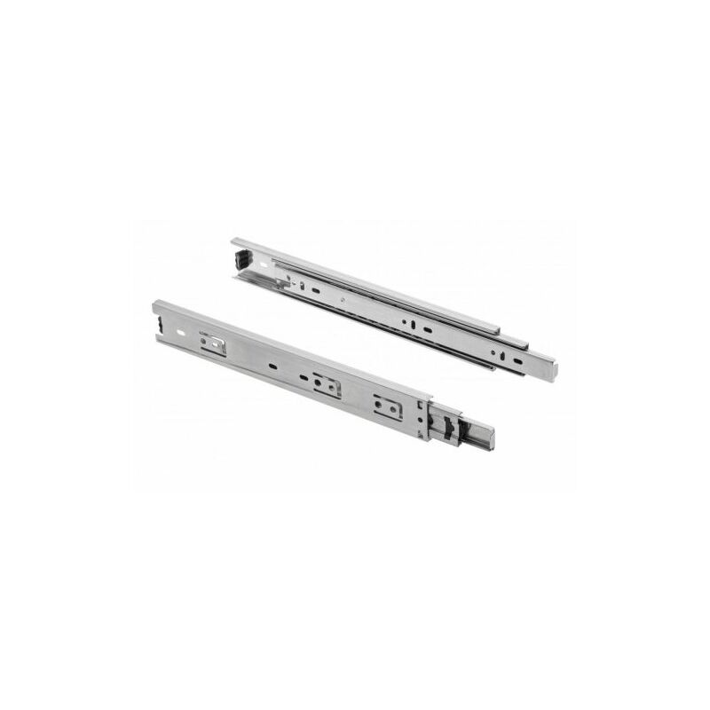 In acciaio zincato lucido. A estrazione totale. Scorrimento su sfere di acciaio. Fissaggio laterale. Portata 30 kg Lunghezza 30 cm
