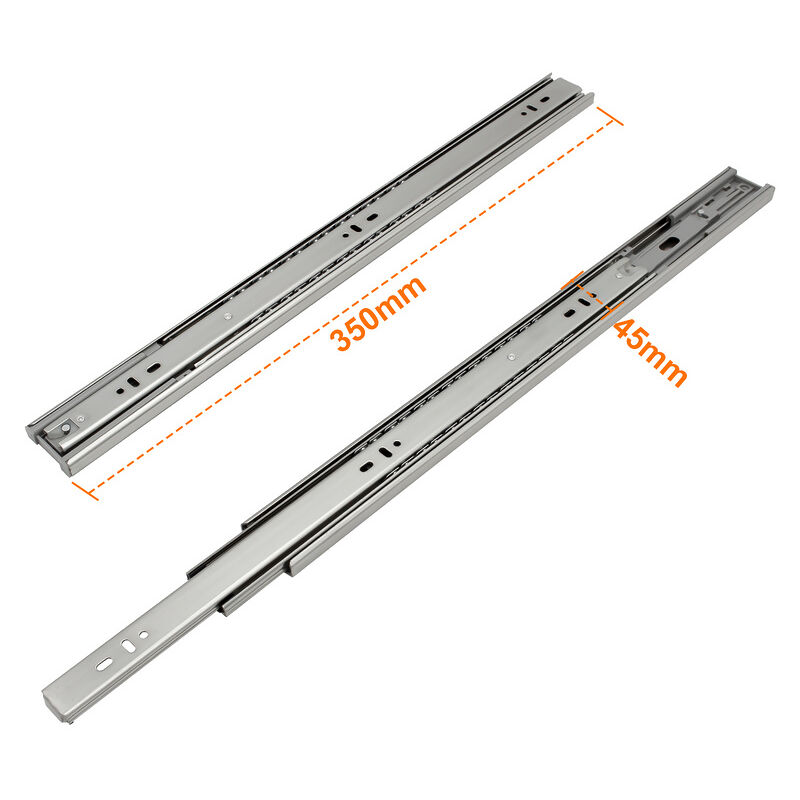 Le guide per cassetti a tre pezzi possono essere estese completamente, in modo silenzioso e senza attrito, il materiale spesso è forte e durevole, le guide per cassetti sono dotate di auto-chiusura e ammortizzazione per prevenire inceppamento, adatto a camere da letto, camere per bambini, soggiorni, cucine, bagni e mobili da ufficio, ideale per installazioni a cassetto. Dati tecnici: Quantità: 2 coppia (4 pezzi) Materiale: acciaio laminato a freddo Tipo: carrello con cuscinetti a sfera in acciaio Numero di sezioni: 3 nodi Lunghezza: 350MM Lunghezza estesa: 700 mm Larghezza: 45 mm Spessore: 1,2 x 1,2 x 1,5 mm Capacità di carico: 35 kg Dimensioni: 250 x 45 x 12,7 mm Peso: 2,02 kg installazione: montaggio laterale Estensione: estensione totale Benefici: Alta stabilità grazie all'acciaio laminato a freddo, nessuna deformazione durante l'uso. Materiale spesso, forte e durevole, nessuna deformazione da flessione Con chiusura ammortizzata e morbida per evitare pizzicature Spinta e trazione