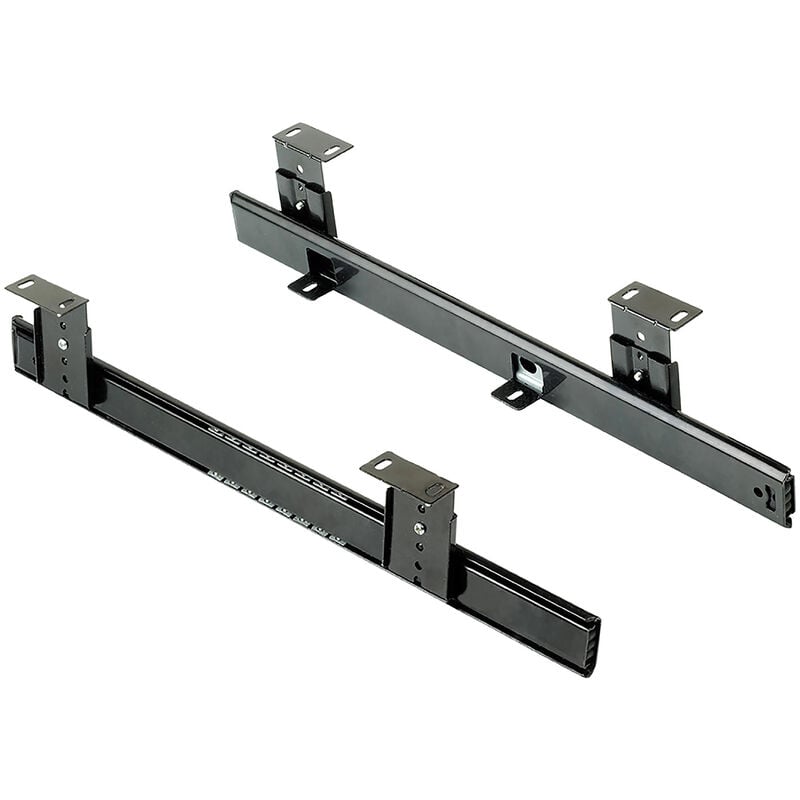 Guide con sfere porta tastiera con regolazione in altezza. Progettata specialmente per i mobili dell'ufficio, scrivanie e tavoli da lavoro. Guide con sfere porta tastiere. Dispone di rigolazione in altezza. I supporti possono essere montati verso l'interno o l'esterno, con linguette per il fissaggio del piano porta tastiera. Con chiusura che permette il fissaggio del piano porta tastiera in posizione chiusa o aperta. 1 set di guide