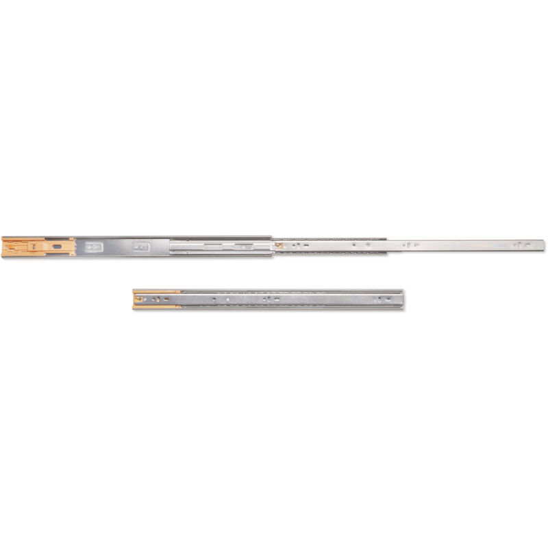 Guide con estrazione totale per cassetti con chiusura soft che fornisce una chiusura ammortizzata del cassetto, e uno scivolamento morbido e silenzioso grazie ai suoi cuscinetti a sfera di alta qualità. Sono noti, inoltre, per la grande capacità di carico che può arrivare a sopportare fino a 35 kg per cassetto. Il montaggio al cassetto si realizza mediante viti e lo smontaggio con grilletto. Guide con cuscientti a sfera ed estrazione totale del cassetto. In acciaio zincato. Altezza 45 mm. Lunghezza 550 mm. Carico massimo per set di 35 kg. Si forniscono in set completi. Dispongono di un pistone ammortizzante in entrambe le guide, che fornisce una chiusura soft del cassetto. Possiede un grilletto per lo smontaggio della guida. 1 set di guide a sfere