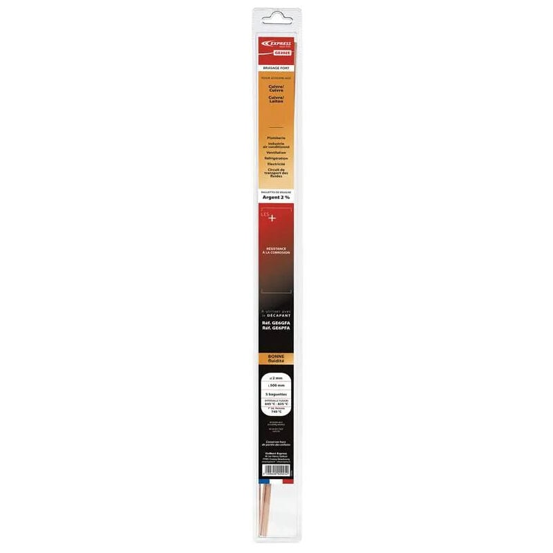 Bacchetta per brasatura all'argento 2%buona fluidità diametro 2mm lunghezza 500mm, confezione da 5 EXPRESS riferimento GE202E Aste di brasatura con 2% di denaro! La brasatura viene tradizionalmente eseguita con bacchette a base di rame e fosforo, disponibili con o senza argento. La temperatura di brasatura deve essere tra 600 e 850 °C. Più argento contiene la barretta, migliori sono le proprietà di bagnatura e più facile è l'applicazione del materiale. Tra i vantaggi specifici di questa referenza GE202E vi è l'eccellente resistenza alla corrosione. La nostra Ref. GE202E è venduta in confezioni da 5 aste. ∅ 2 mm - L 500 mm. Questo GE202E di riferimento offre una buona fluidità e troverà posto tra i professionisti della climatizzazione, dell'idraulica e della ventilazione, della refrigerazione, dell'elettricità e, più in generale, tra tutti coloro che si occupano di circuiti di trasporto di fluidi.