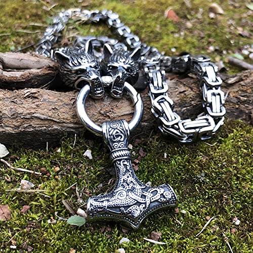 GuoShuang Mjolnir - Collana da uomo con ciondolo a forma di lupo e martello Thor, in acciaio inox, idea regalo, Acciaio inossidabile