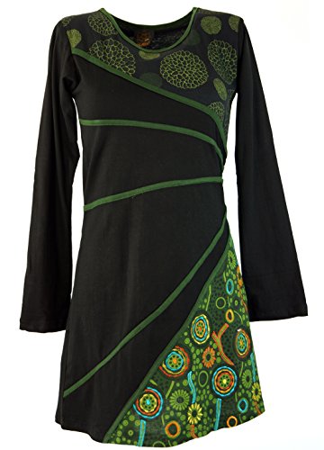 GURU-SHOP, Hippie Mini Abito Boho Chic, Tunica - Nero/Verde, Cotone, Dimensione Indumenti:M (38), Abiti Corti