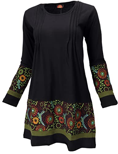GURU-SHOP, Hippie Mini Abito Boho Chic, Tunica, Nero/Verde, Cotone, Dimensione Indumenti:XL (42), Abiti Corti
