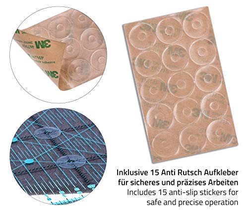 Nessun rischio di scivolare: 15 adesivi antiscivolo gratuiti accompagnano ogni righello patchwork. I tagli dritti diventano un gioco da ragazzi.