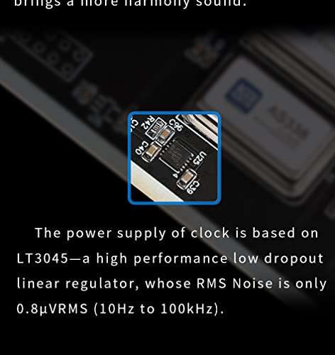 Trasformatore toroidale specifico per audio: L'alimentazione di clock è basata su LT 3045-un regolatore lineare a basso dropout ad alte prestazioni, il cui RMS Noise è solo 0.8μVRMS (da 10Hz a 100kHz).