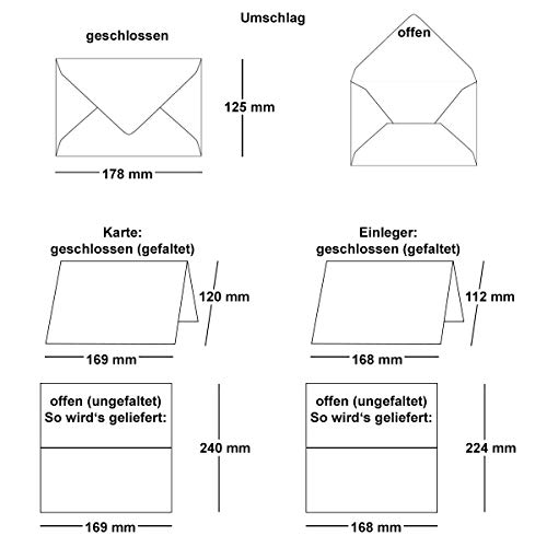 Formato biglietti: DIN B6 - 120 x 169 mm (12,0 x 16,9 cm) piegato - 169 x 240 mm (16,9 x 24,0 cm) aperto. Materiale resistente per i più esigenti. 100% ecologico, solo in carta riciclata senza sbiancanti e coloranti. Grammatura: 220 g/m²