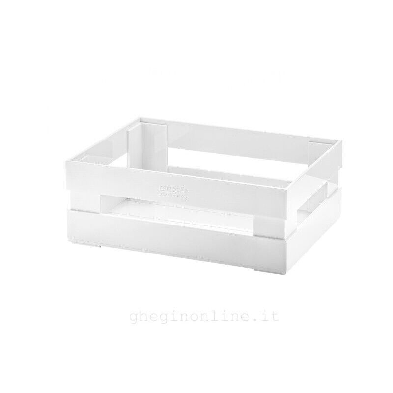 ma anche sulla tavola per servire frutta, o pane e perché no su una scrivania con penne e cancelleria, come svuota tasche su una mensola o come porta piante aromatiche sul davanzale della cucina. Caratteristiche della cassetta: • Impilabile • facile da pulire perché non assorbe nessun tipo di liquido • resistente agli urti • Lavabile in lavastoviglie • Realizzata in materiale plastico 100% riciclato • Dimensioni 15x11cm • Colore bianco