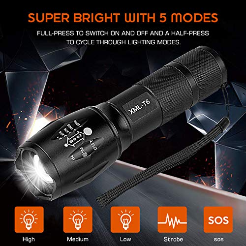 GVOO torcia LED 1000 estremamente chiara XML-T6,2 Pack LED tattica torcia, super luminoso ad alte prestazioni, impermeabile, 5 modalità di illuminazione torcia portatile per la libertà con messa a fuoco regolabile e per interni, batteria o batteria nero