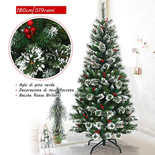 GYMAX Albero di Natale Artificiale 180 cm, 365 Rami Realistici in PVC, 46 Mazzi di Bacche, 154 Aghi di Pino, Base in Metallo, Divisibile per Montaggio e Trasporto, Ideale per Casa, Negozio e Ufficio