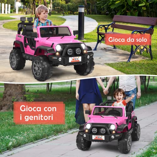 GYMAX Macchina Elettrica con Telecomando per Bambini, Macchina Cavalcabile a 2 Posti con Cinture, con Avvio/Freno Graduali, Musica tramite USB, 3 Velocità Regolabili, Portata 50kg (Rosa)