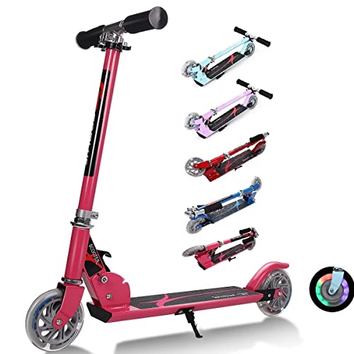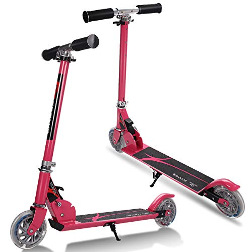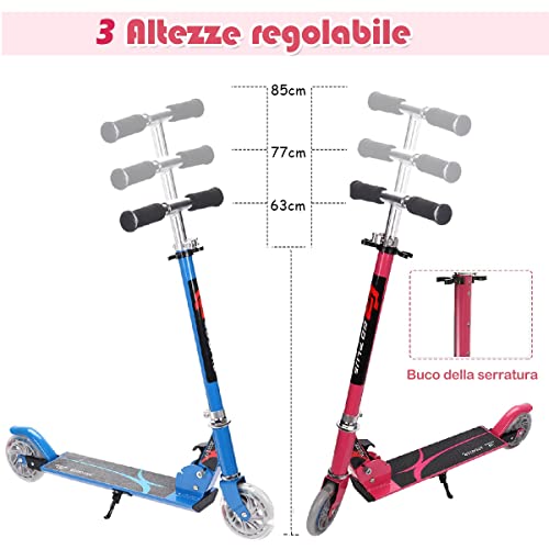 GYMAX Monopattino a Spinta per Bambini 4-13 Anni, 2 PU Ruote Luminose, Regolabile a 3 Altezze 63-85 cm, Manubrio Pieghevole, Scooter in Alluminio, Freno Posteriore, Carico di 70 kg, Rosa