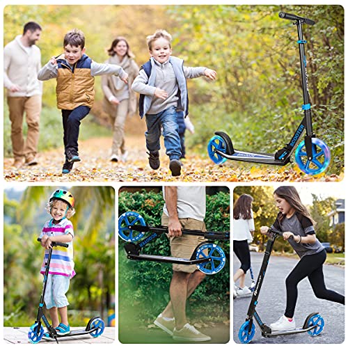 GYMAX Pieghevole Monopattino a Spinta per Bambini 10+ Anni, 3 Altezze Regolabili, PU Ruote Luminose di 20 cm, Portata di 100 kg, in Alluminio, Freno Posteriore, Cinghia da Trasporto, Blu