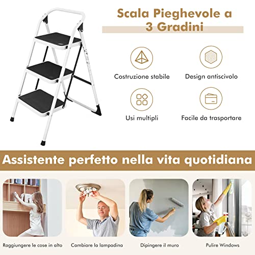 GYMAX Scaletta 3 Gradini in Metallo, Scala Salvaspazio e Pieghevole con Gradini Antiscivolo, Sgabello Multifunzionale con Cuscinetti Antiscivolo e Maniglia Ergonomica, con Portata di 150 kg