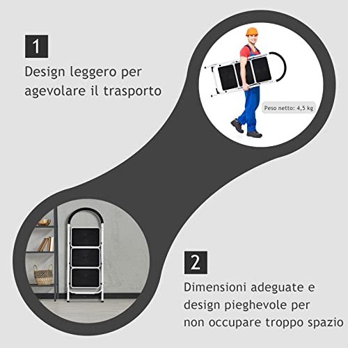 # Trasporto e conservazione facili # La scaletta con 3 gradini si può piegare velocemente e per risparmiare tempo ed energia e per non occupare troppo spazio quando non è in uso, in più, grazie al design pieghevole, si può spostare facilmente da una parte all'altra.