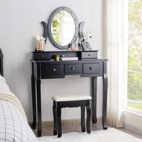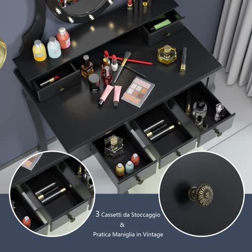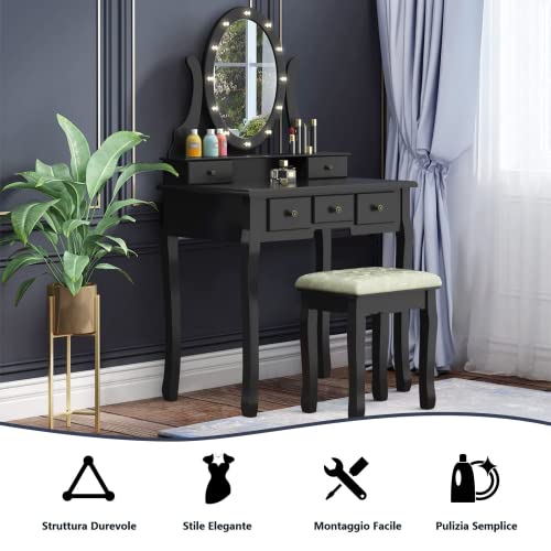 GYMAX Toeletta da Trucco, con 12 Lampadine LED Illuminate, 5 Cassetti per Cosmetici, Specchio Inclinabile e Staccabile, Design 2 in 1 per Camera da Letto, 80x40x142 cm, Nero