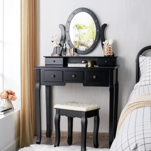 # Ampio spazio di archiviazione # Questa toletta ha un grande piano ed è dotato di cinque cassetti per cosmetici e gioielli. Non solo puoi truccarti, puoi anche leggere libri ed usare notebook su di esso, è molto conveniente.