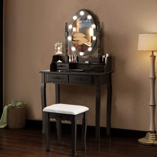 GYMAX Toeletta da Trucco, con 10 Lampadine LED Illuminate, 4 Cassetti per Cosmetici, Luci Regolabili, Specchio Inclinabile e Staccabile, Sgabello Imbotitto, Filo di 1,5 M, 75x40x146 cm, Nero
