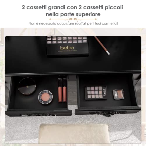 # Pratico spazio di archiviazione # Grazie al design a due strati, oltre ad avere un grande piano, la nostra toeletta è dotata di 4 cassetti di diverse dimensioni che possono contenere vari cosmetici per evitare che il piano del tavolo sia in disordine. Inoltre, grazie al design con maniglia, sono facili da chiudere e aprire.