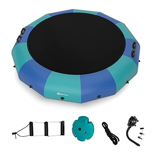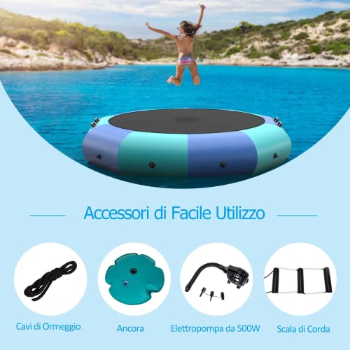 GYMAX Trampolino Elastico Acquatico Gonfiabile, Carico di 150kg, Elettropompa di 500 W(1,8M), Scaletta Corda, 3 x Cinghie, Ideale per Piscina/Mare/Lago (457x65cm, Blu)