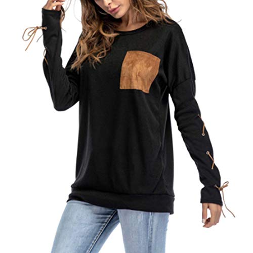 GYUANLAI Felpa Girocollo Patchwork Girocollo Manica Lunga Casual Donna Allentata Tinta Unita con t-Shirt Inferiore con Cinturino Tascabile(Nero-S)