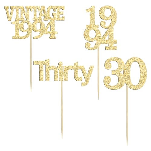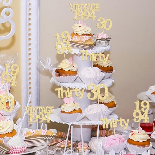 Gyufise 24 topper per cupcake con scritta "Happy 30th Birthday", glitterati, 30 favolosi plettri vintage per cupcake del 1994, per 30° compleanno, anniversario di matrimonio, feste, decorazioni per